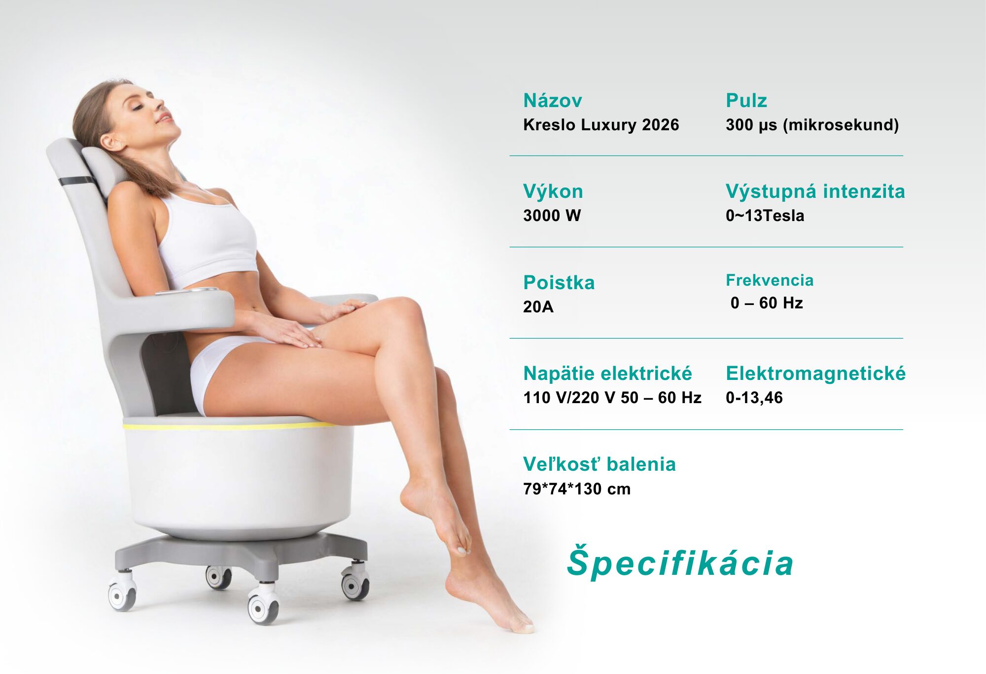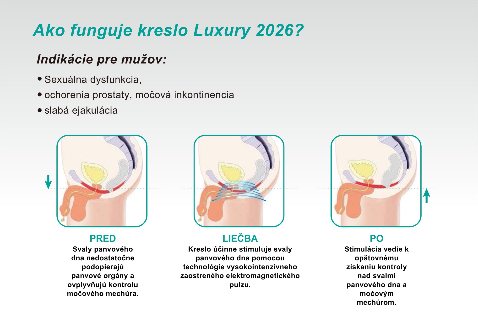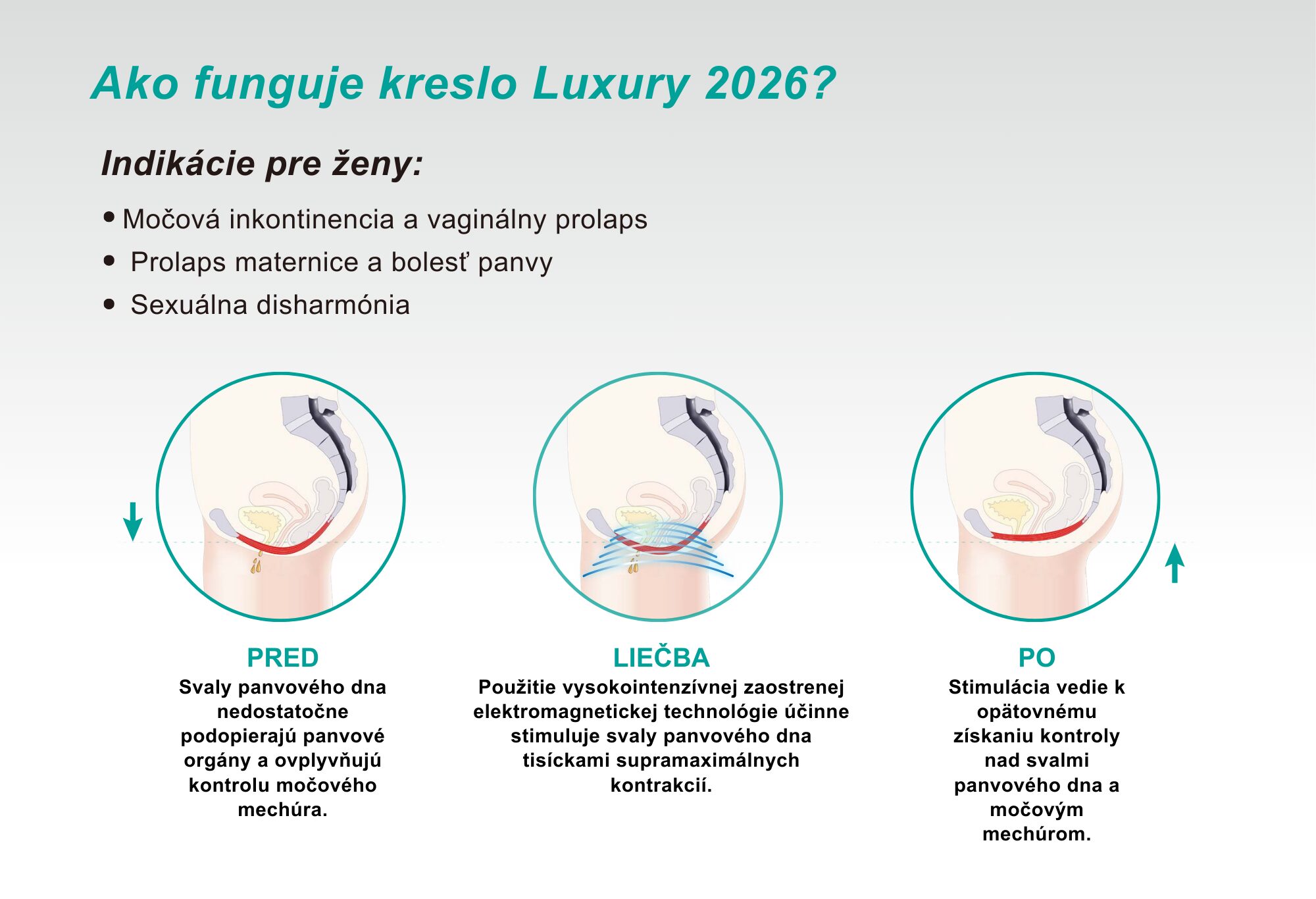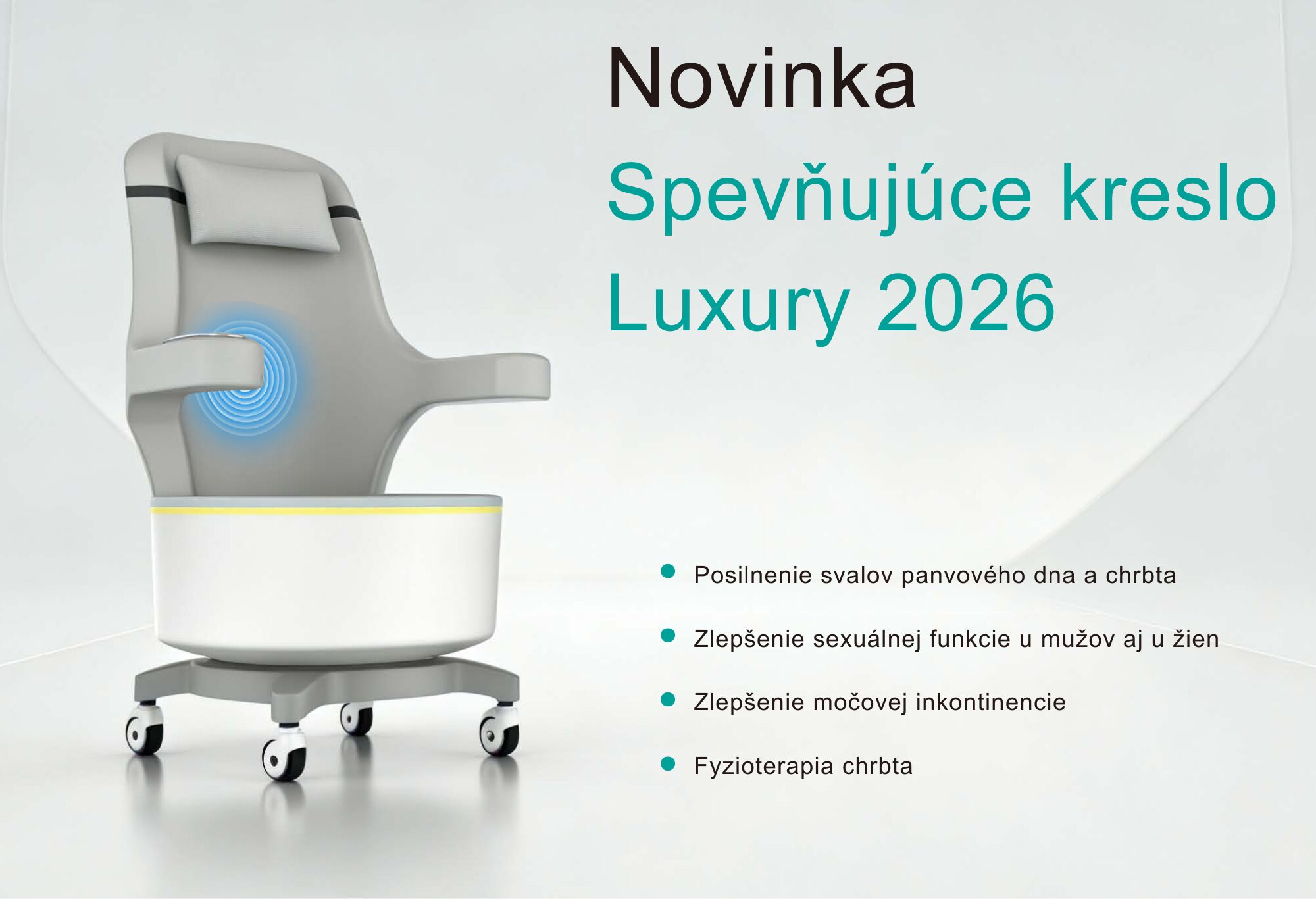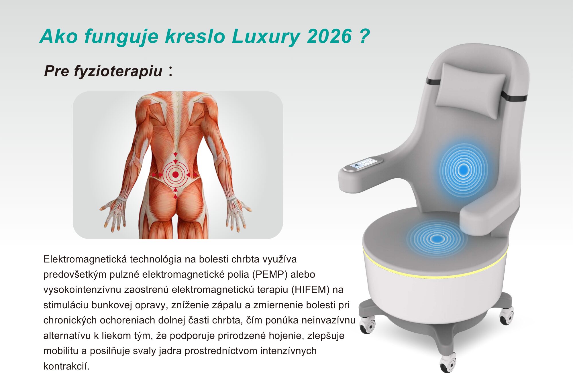 Elektromagnetické kreslo Luxury 2026, pre posilnenie svalstva v oblasti panvového dna a chrbta, využíva technológiu vysokovýkonného sústredného elektromagnetického poľa na stimuláciu hlbokých svalov a obnovenie nervovo-svalovej kontroly.