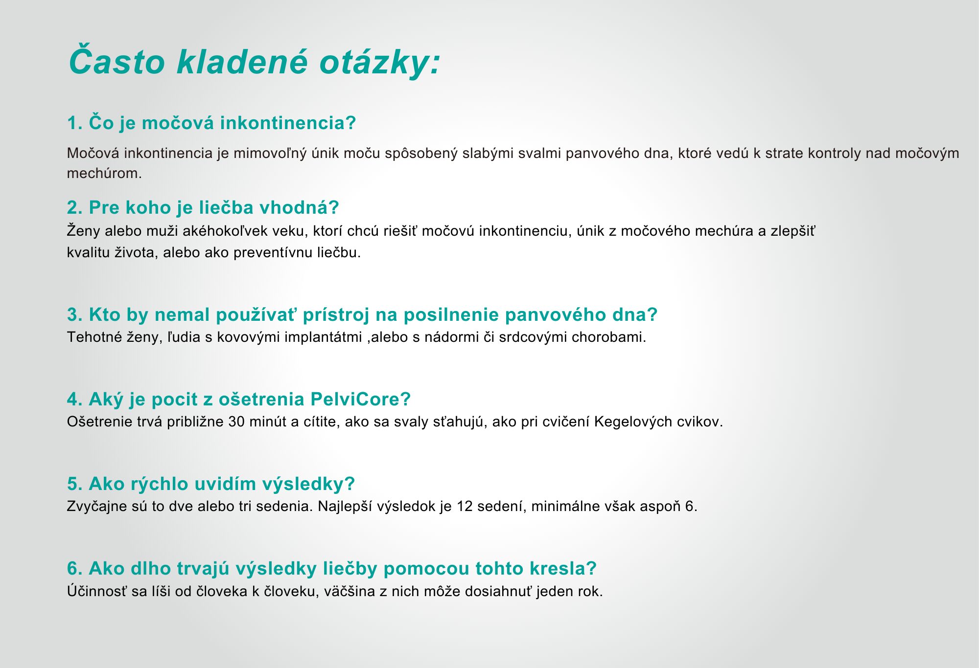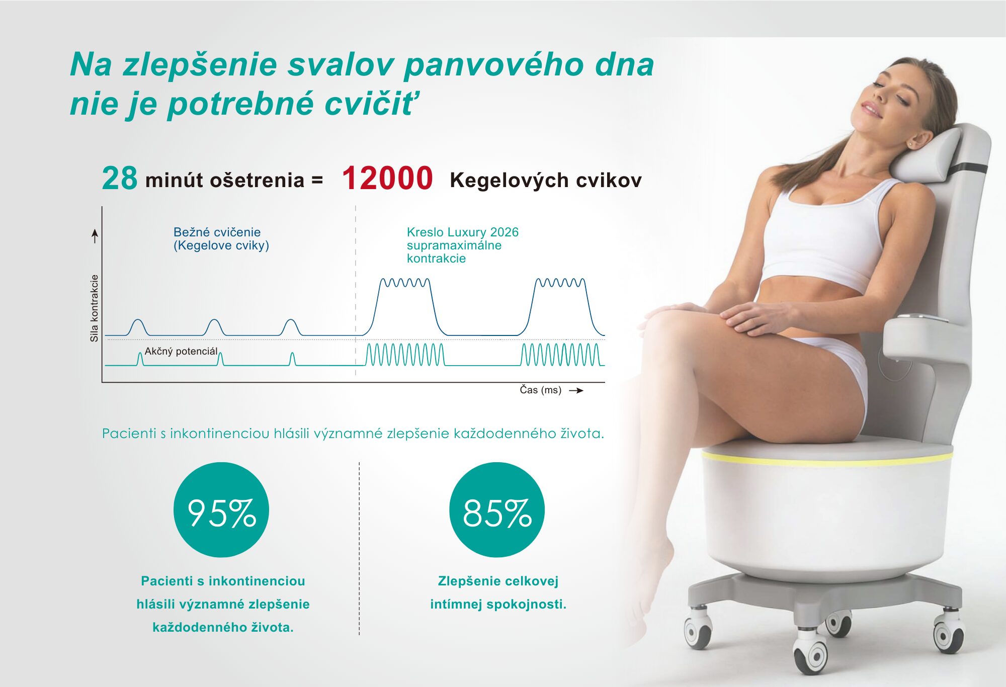 Počas jedinej 30 minútovej terapie dochádza k maximálnym kontrakciám svalov panvového dna, ktoré zodpovedajú aspoň12000 opakovaní Kegelových cvikov.