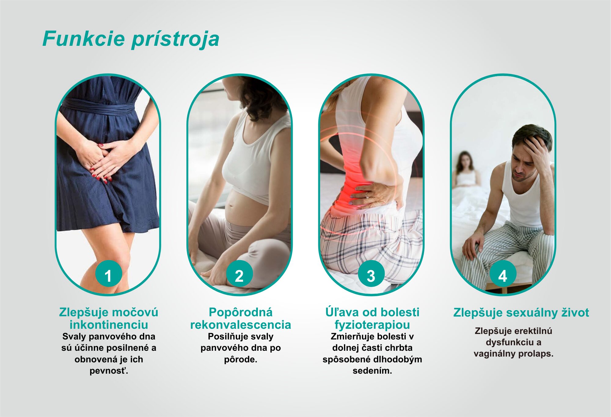 Týmto sa svalstvo v danej oblasti výrazne posilní, čím sa výrazne zredukuje (až zastaví) nekontrolovateľný únik moču (inkontinencia) a stolice.